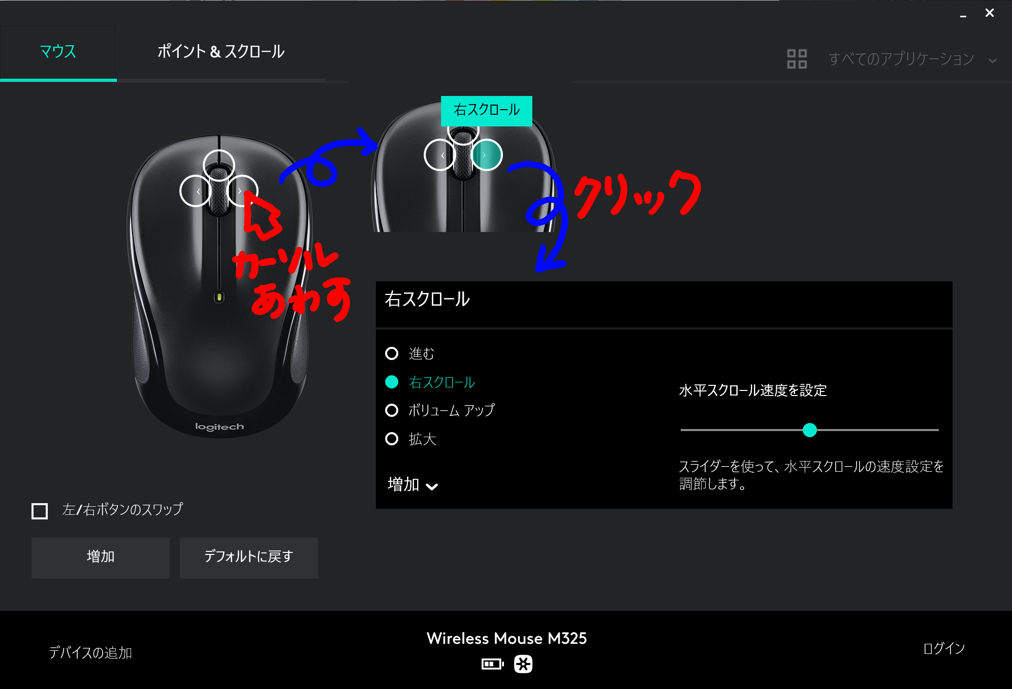 ウェブスクロール用マウスということもあり初期設定では、チルトは「戻る」、「進む」動作となっている。マウスを接続し「logicool options」起動で認識し、下の通り左右のスクロール設定が行える。これで左右スクロールが動くようになった!